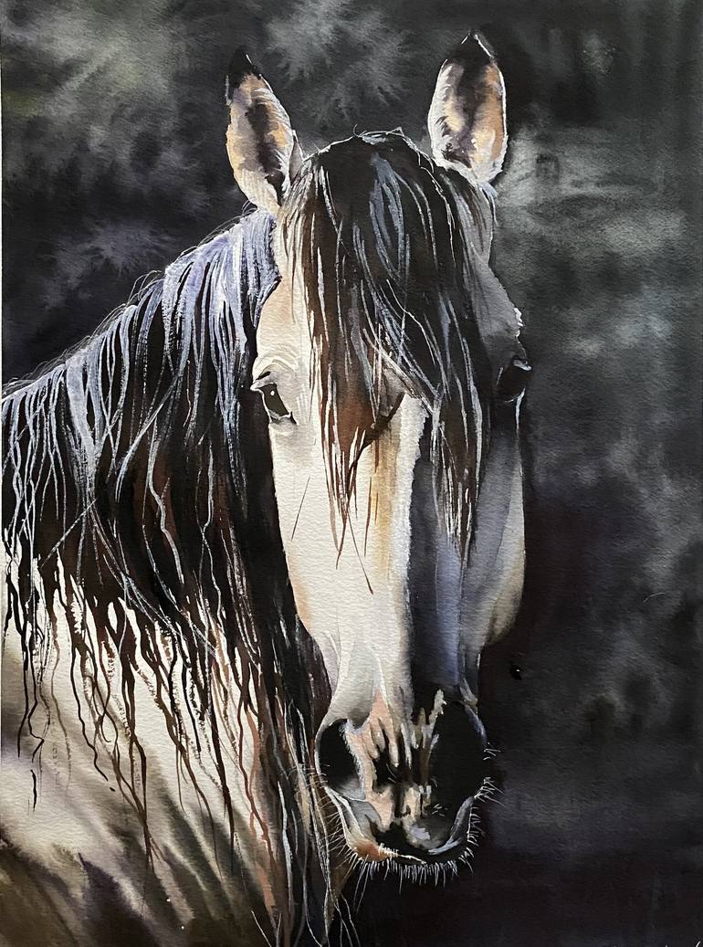 A beautiful white horse. Her name is Rain. She stands illuminated by the sun. Watercolor painting, Prague, 2023.