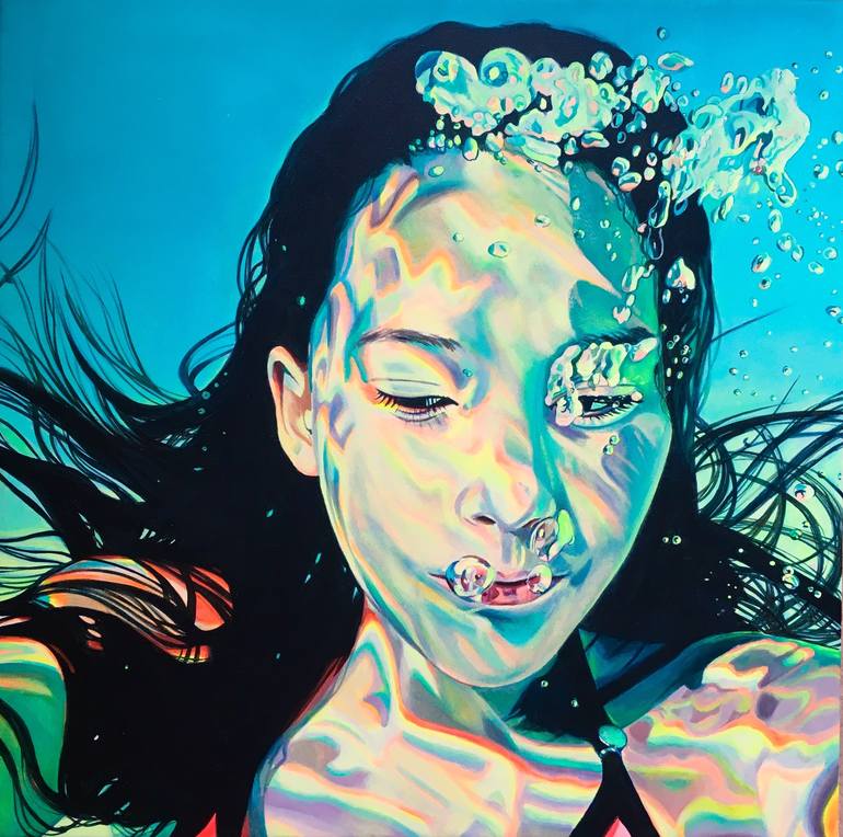 Girl exhaling underwater with sunlight fractal in neon bright rainbow hues drawn on her skin, reminding us of how we are projection screens of what surrounds us, simply reflecting the light that hits us