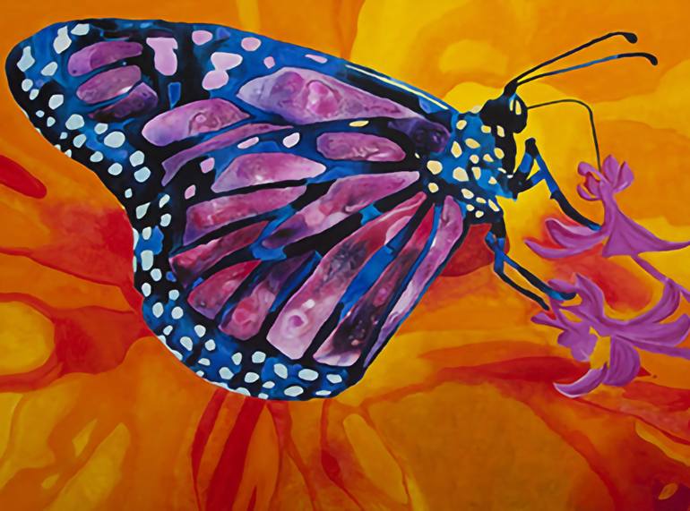 I took this photo at a butterfly garden at the Phoenix Zoo and made it a painting in my style. It is a Monarch butterfly using a watercolor technique using many colors.