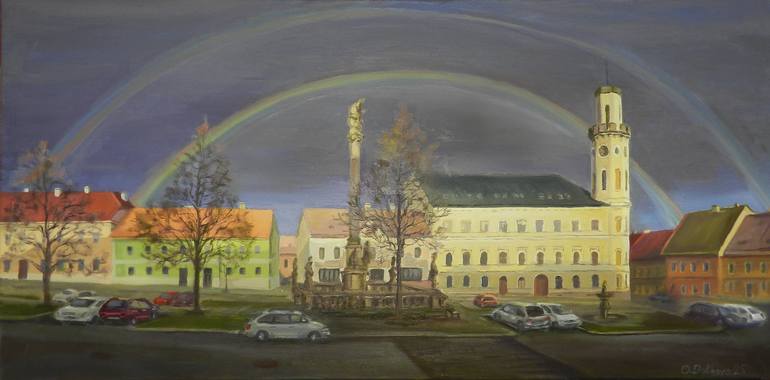 This atmospheric cityscape depicts the central square of Klášterec nad Ohří, a picturesque town in the Czech Republic. Dominating the scene is the historic town hall, softly illuminated by sunlight breaking through a stormy sky. A rare double rainbow arcs across the horizon, casting a magical glow o...