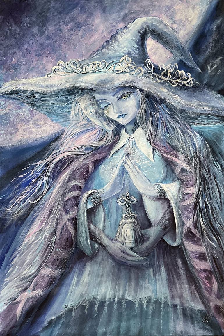 The painting depicts the witch Rannie from the video game Elden Ring. Rannie is dressed in a long, flowing blue cloak decorated with magical symbols and mysterious patterns. Her hat is wide-brimmed, with the brim pulled down to hide her face, but from beneath it you can see glittering, sparkling ey...
