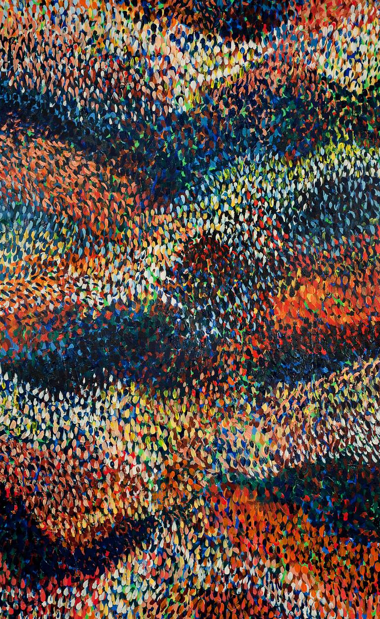 Similar to Rapture, No, 3, the painting continues the same technique of applying layers of colors in a pointillistic manner, with an intention of creating movement or energy, versus a static figure. The hills and valleys dance like moving particles, reminiscent of DNA/Chromosome structures.
