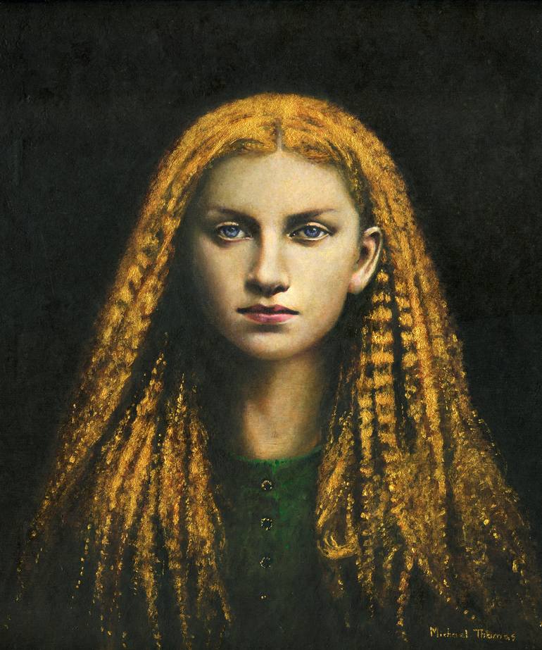 This portrait depicts a beautiful golden haired Rapunzel. The original is painted in acrylic on wood, the hair being rendered in acrylic gold paint to give a glistening shimmer. The heroine has a sad questioning almost mournful expression giving the work a slightly dark Gothic feel.