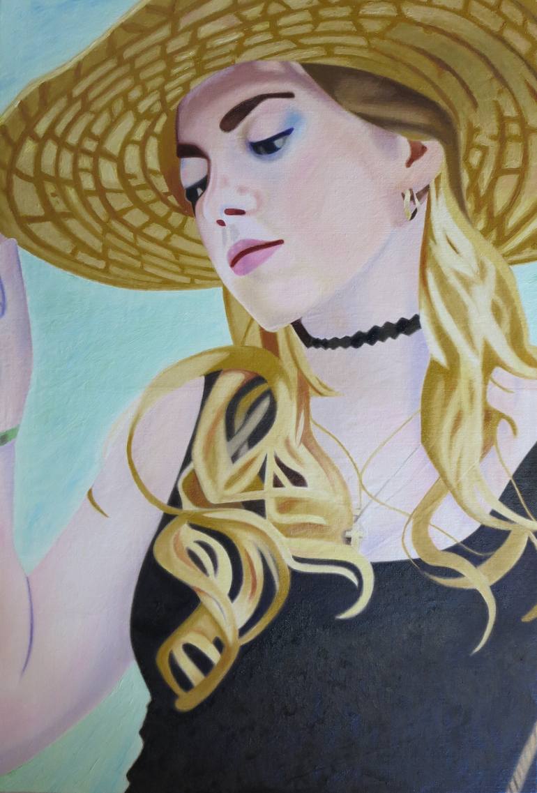 Her hat makes me think about Vincent. Signed, titled, and dated (3-8-17) on the reverse. Personal seal on left. I re-create what I see and paint artwork with a humane concern that connects Art with humanity. I begin to paint in slashing fast brushstrokes and pallet knife techniques using dark hea...