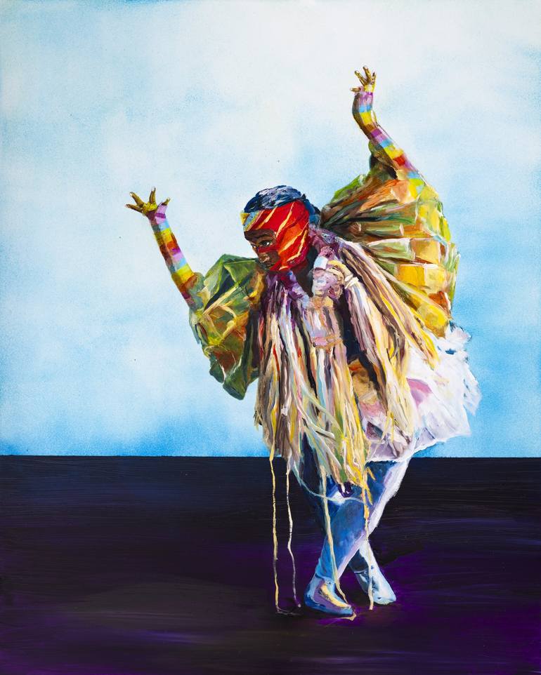 Inspired by a dance ensemble piece of the same name, re:incarnation explores themes of rebirth and transformation through vivid color and dynamic movement. A masked figure stands poised on tiptoe, arms raised in a gesture that suggests both release and renewal. Layers of richly hued fabric and brush...