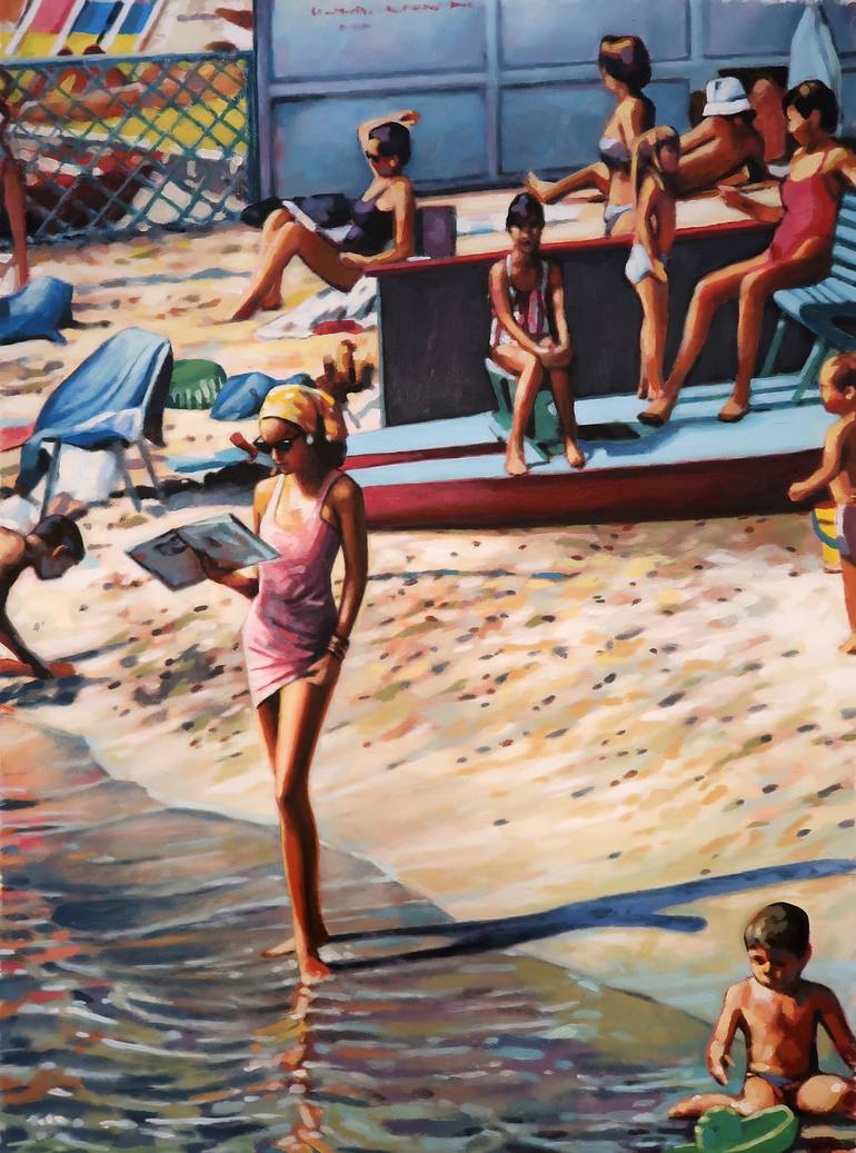 From my Mallorcan studio, stylish girl and crowded beach make for nice contrast.