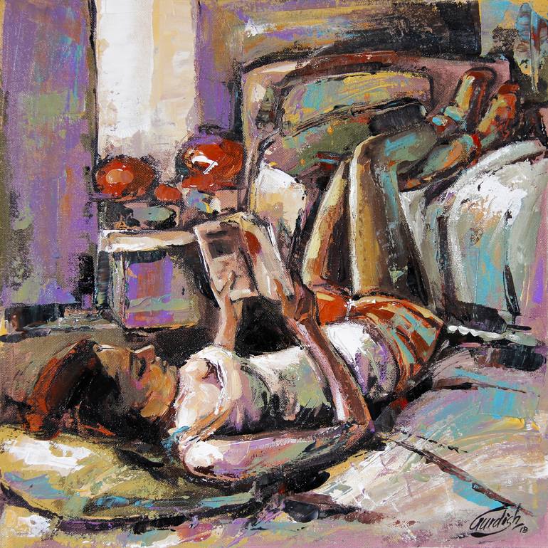 "Reading his poems" is a beautiful acrylic painting on canvas, a modern figurative piece with touches of abstract expressionism and illustration. The artwork captures a woman, perhaps an Indian girl, lost in thought, reminiscent of a love so profound it permeates her very being. Does she feel the de...