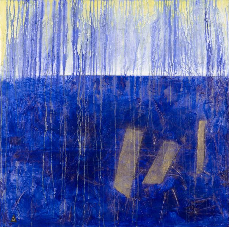 Reappearance is a post-apocalyptic image. The Sun shows up and hope for a new beginning springs in a form of a yellowish tone. What little of good is left is resurfacing in a form of a lost treasure, that is why the golden nets are seen on the blue surface. That is the only thing of substance, thus ...