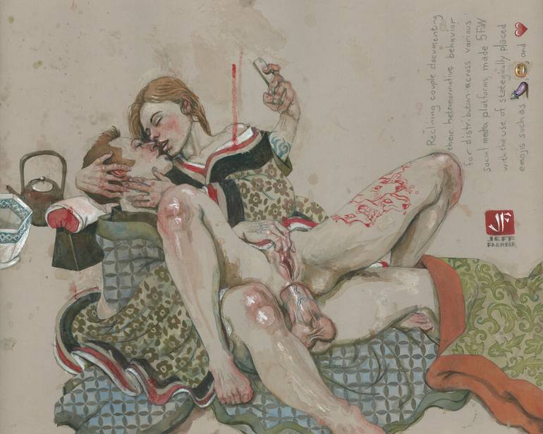 TITLE: Reclining couple documenting their heteronormative behavior for distribution across various social media platforms, made SFW with the use of strategically placed emojis such as [eggplant emoji] , [smiley emoji], and [heart emoji] mixed media on archival matte-board based on traditional ero...