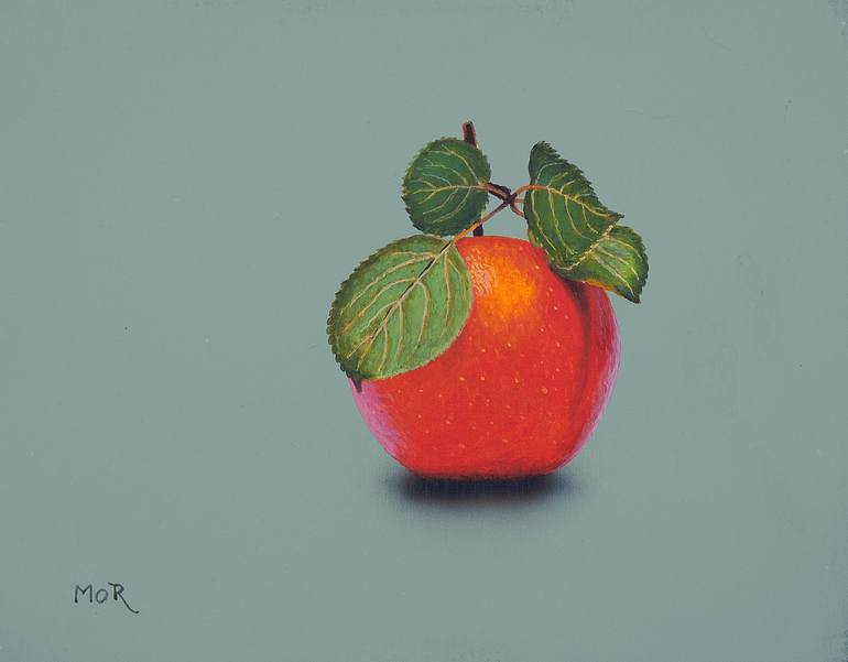 A red apple with stem and leaves freshly picked from the tree. The background is deliberately monochromatic and lacks depth in order to draw full attention to the fruit. The entire composition is kept minimalist on purpose. Acrylic on canvas panel with UV resistant varnish