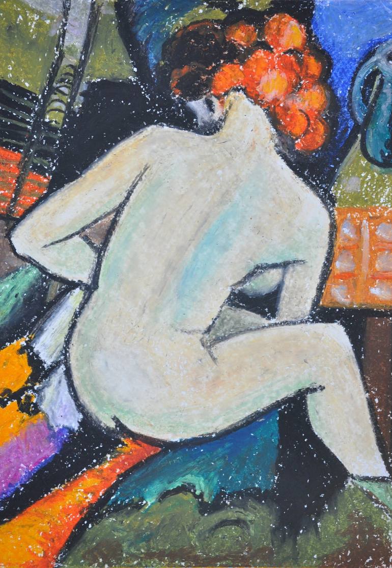 The motive for the Bathers series was the symbol of primordiality and naturalness. This work is one of a series dedicated to nude in the female beginning. The painting is made in the technique of oil pastels on paper.