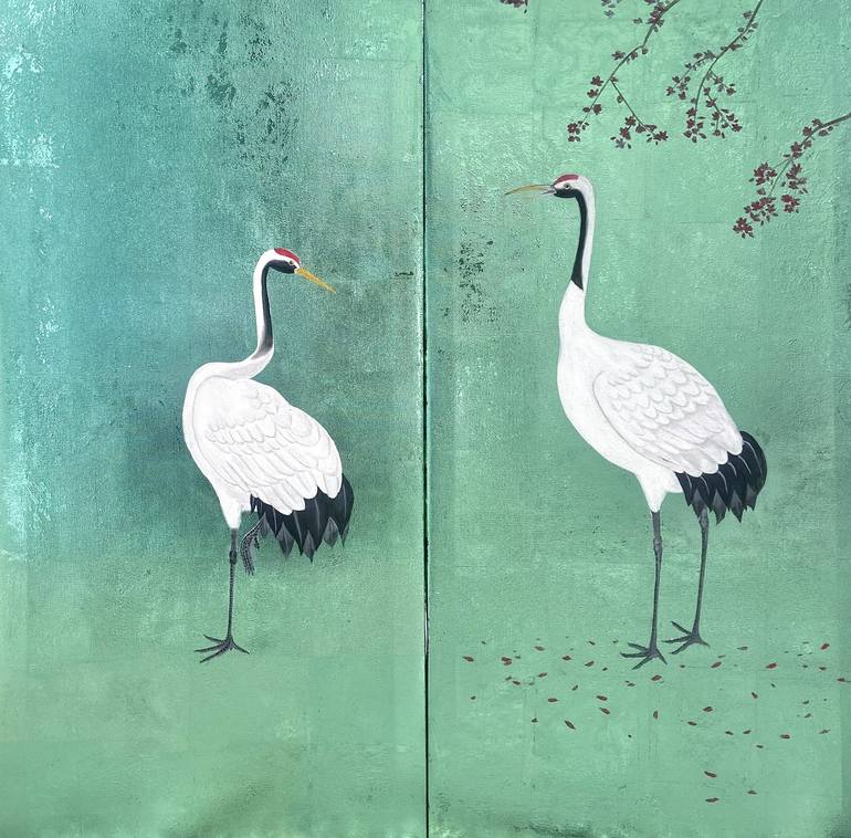 A set of two Japanese-inspired paintings featuring red-crowned cranes amid cherry blossoms. The green foil background creates a stunning metallic 3D effect, highlighting the details of each bird and flower. Perfect for lovers of Japanese art, these paintings combine traditional motifs with modern ar...