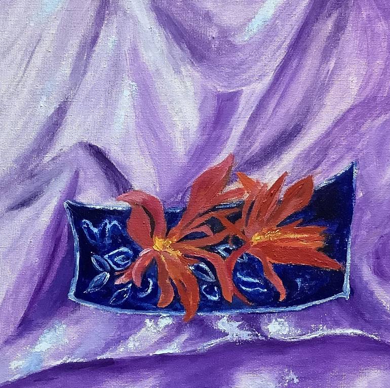 Red Flowers on Purple Abstract Fuchsia Original Painting in oil on Canvas 12x12" Artwork by Antonina Dunaeva-Come4Art The painting depicts red flowers Fuchsia on a purple drapery. It is a beautiful annual flower blooming during whole summer and good for shades. I only make original works. Each is...