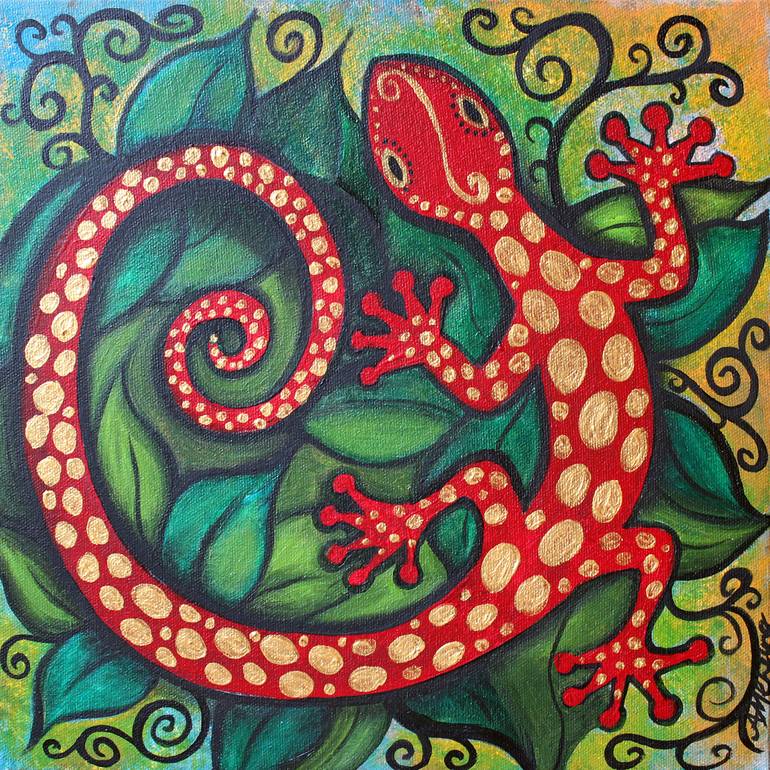 Colorful stylized red and gold spotted Gecko inspired by my travels to the Caribbean. Acrylic on gallery wrapped canvas.