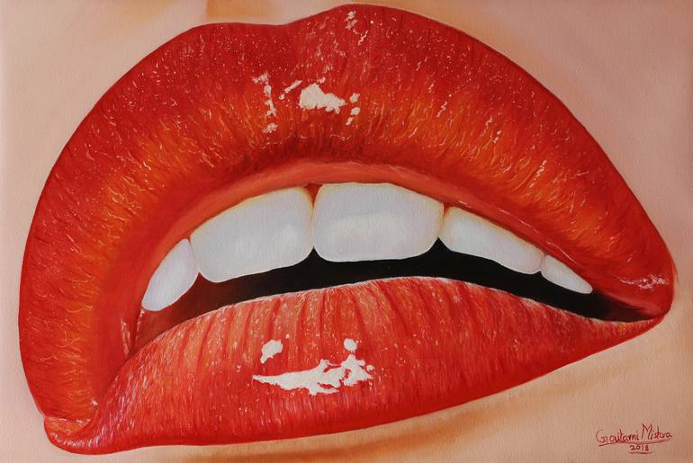 This is an oil painting of red glossy lips with shining bright colors. It is a realistic painting with closeup detail. I have left 2 inches margin from all sides excluding painting size for framing.