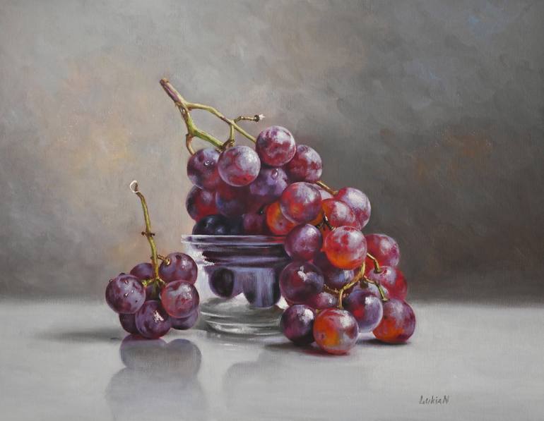 This artwork is based on my original oil painting, created from life. A realistic still life featuring ripe red grapes arranged around a small glass jar. The painting explores the play of light on translucent surfaces, the weight and freshness of the fruit, and the quiet harmony of everyday objects....