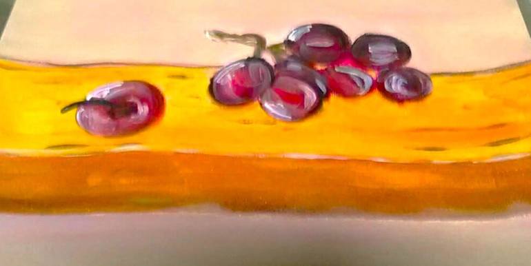 I am here painting with my acrylics pallette a bunch of dark red grapes that lay in a wooden plate. In this one I utilised natural colours rather than my own different perspective for a more impressionistic approach.