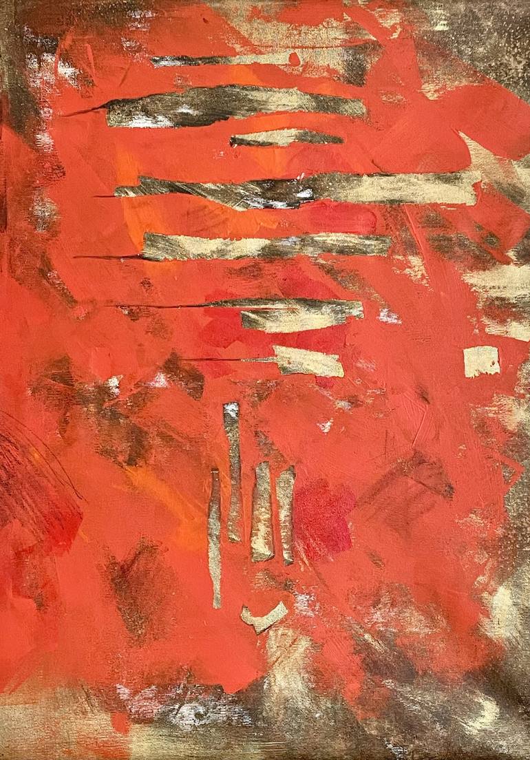 Abstract painting is strong, warm cadmium red over layers of van Dyck brown and gold. Stretched, ready to hang, sides painted, framing recommended