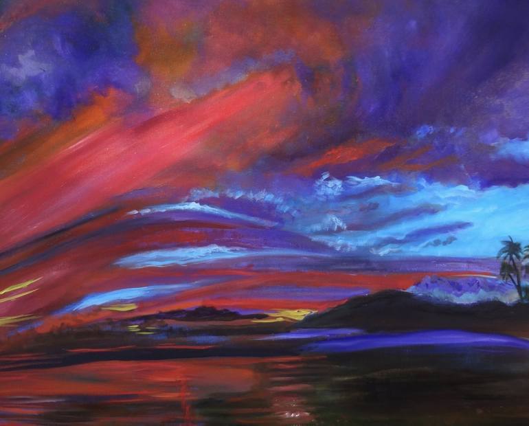 Original oil painting on stretched canvas. Colorful horizons original one of a kind painting of seascape, red and purple sunsets. Sun peeping through.