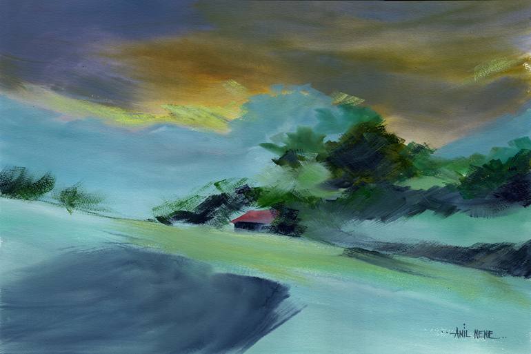 A red roof stands out against contrasting background of bluish green, grey. I have used watercolours with addition of whites and yellows.