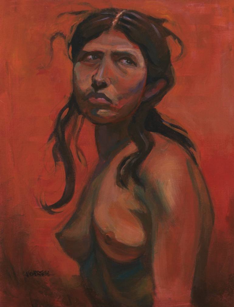 This nude portrait is highly textured as a result of a dry-brushing technique that also creates something both graphic and essential. Her expression tells of a woman having a fervently religious experience, her eyes filled of sacrifice. The intention was to craft a larger-than-life contemporary rend...