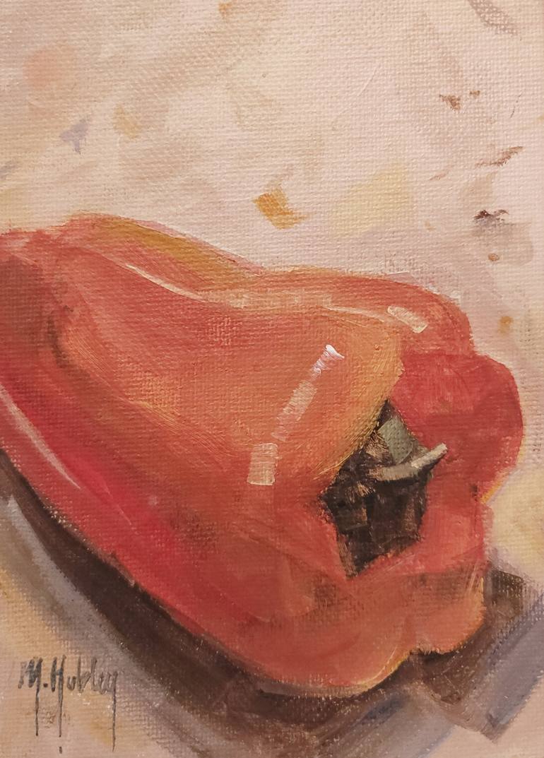 A simple, minimal painting of a red pepper. This painting was created with quality materials on a canvas panel.