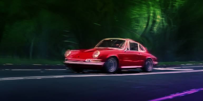 Beautiful red Porsche 911 T, a classic car driving near a park at dawn.