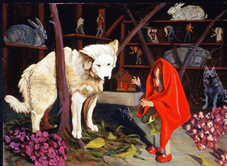 "Red Riding Hood." is an oil painting on canvas that illustrates the traditional folk tale. The artist's technique lends itself to both realism and illustration, bringing a sense of fantasy to the figurative subject. This captivating, medium-sized piece is sure to draw the eye and spark conversatio...