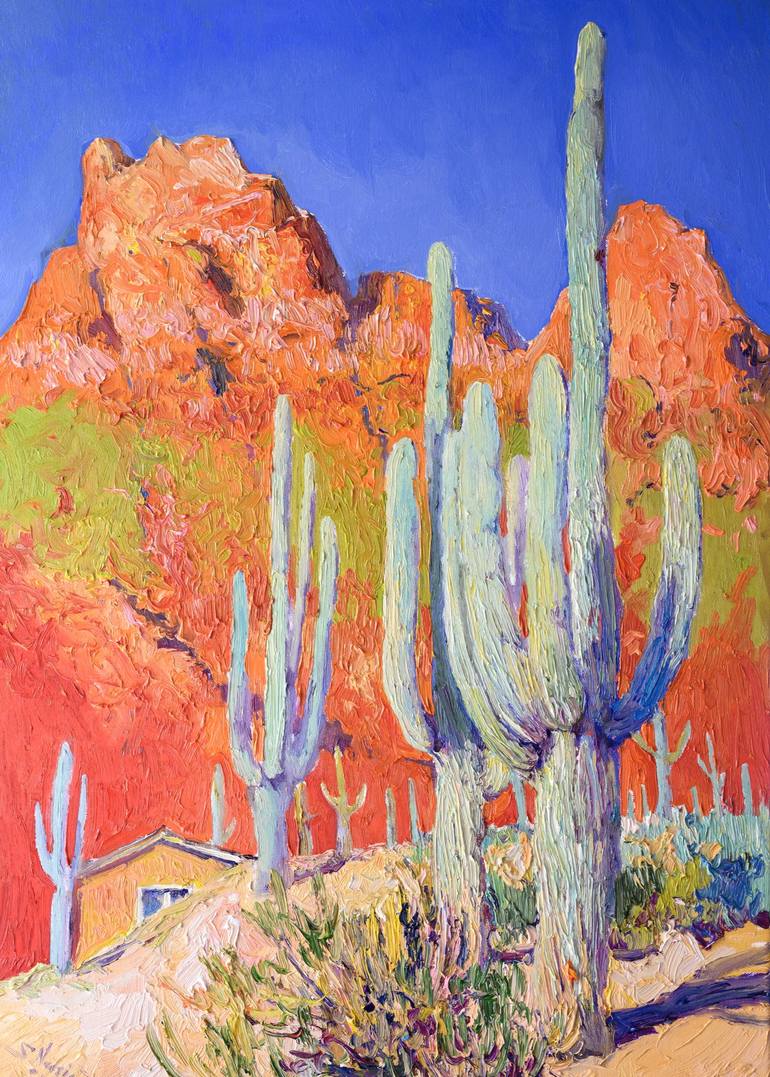 The soft turquoise-green shape of Saguaro cactuses and red rocks in the Arizona desert create a beautiful contrast full of life and energy from the sun. The artwork is on oil-primed canvas, stretched on wooden bars. It has a wire on the back to be displayed even with no frame. ,
