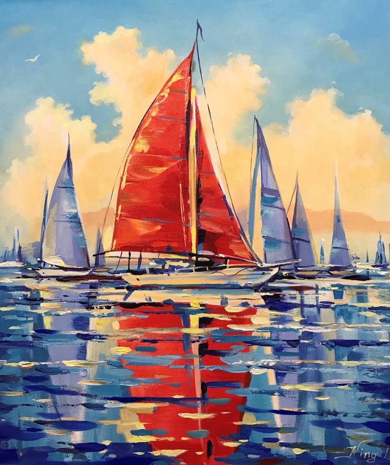 This is Ocean Sailing Boat Oil Painting "Red Sailboat". Large Abstract Sailboat Painting Red Sailboat Art Abstract Ocean Art Sailing Boat Art Nautical Oil Painting Red Sailboat Painting Gift. The nautical scene, sailboat trips on the ocean, vacations on the sea. Feel freedom and energy from this br...