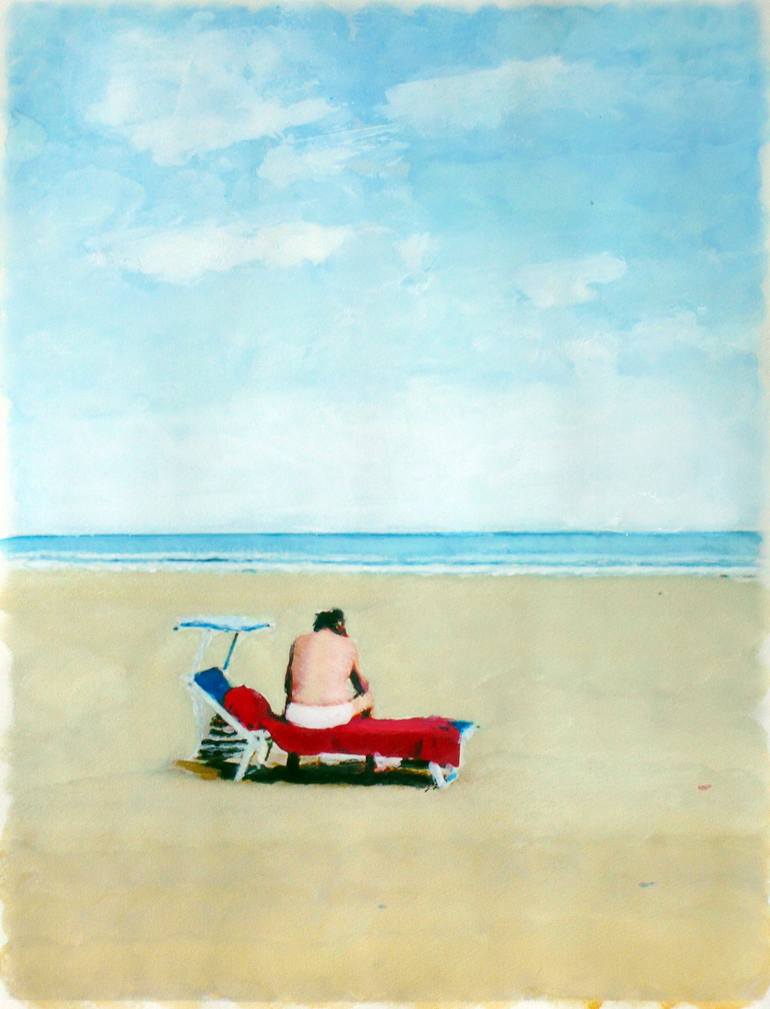 Red Towel A man on the beach surrounded by massive solitude. Loneliness at its best. Isle of Fehmarn 2014 Acrylic used in watercolor technique. painting acrylic on paper dimensions 40cm x 30cm signed & dated