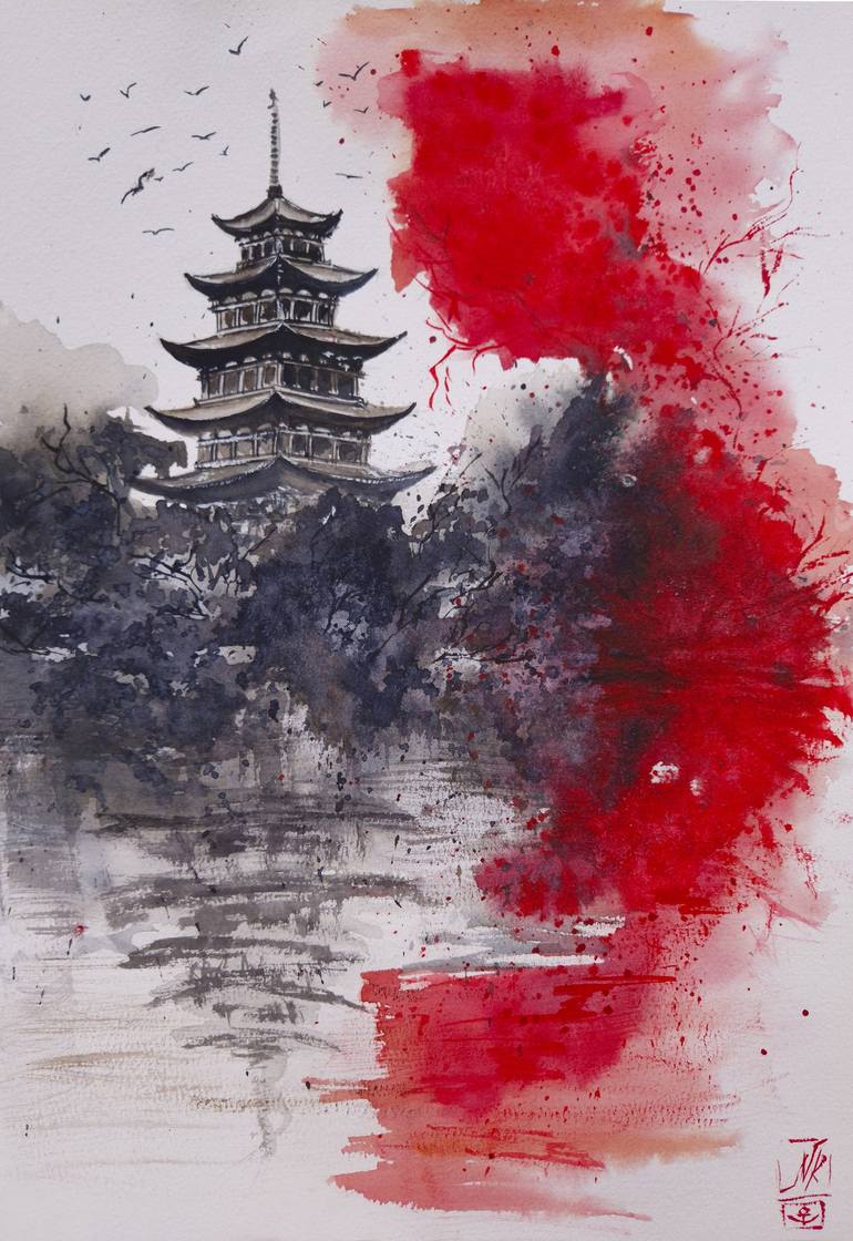 "Red Wind" is a dialogue between stability and change, tradition and upheaval. This painting contrasts the structured harmony of Eastern architecture with the violent swirl of crimson gusts, evoking a sense of tense equilibrium. Deep shadows symbolize established traditions, resisting the fiery flas...