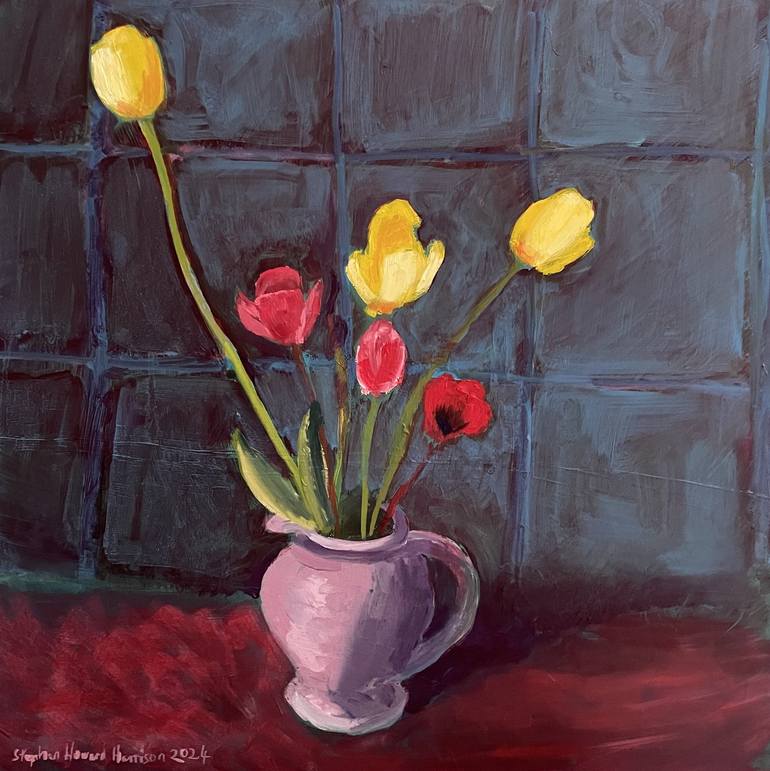 This is my second painting of this arrangement with tulips in a jug. I wanted to communicate the intense colour of the tulips and their long elegant stems.