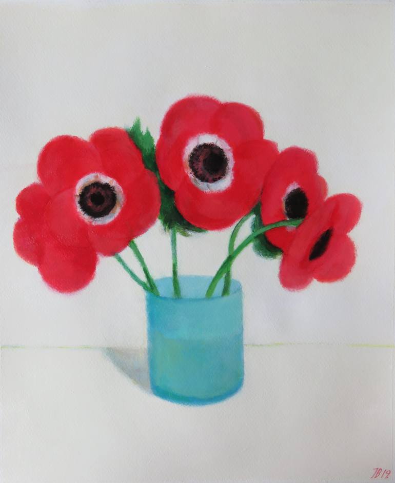 "Red anemones" 17" X 14" acrylic/watercolour paper 2019.SOLD. Private collection,United States. Painting is not framed. This painting was inspired by beauty of red anemones.