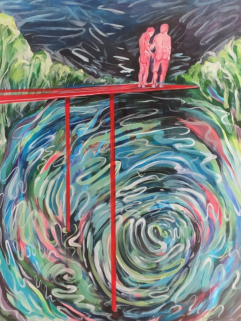In a brief moment before they jump, two men overlook the lake and think about the way they will jump.