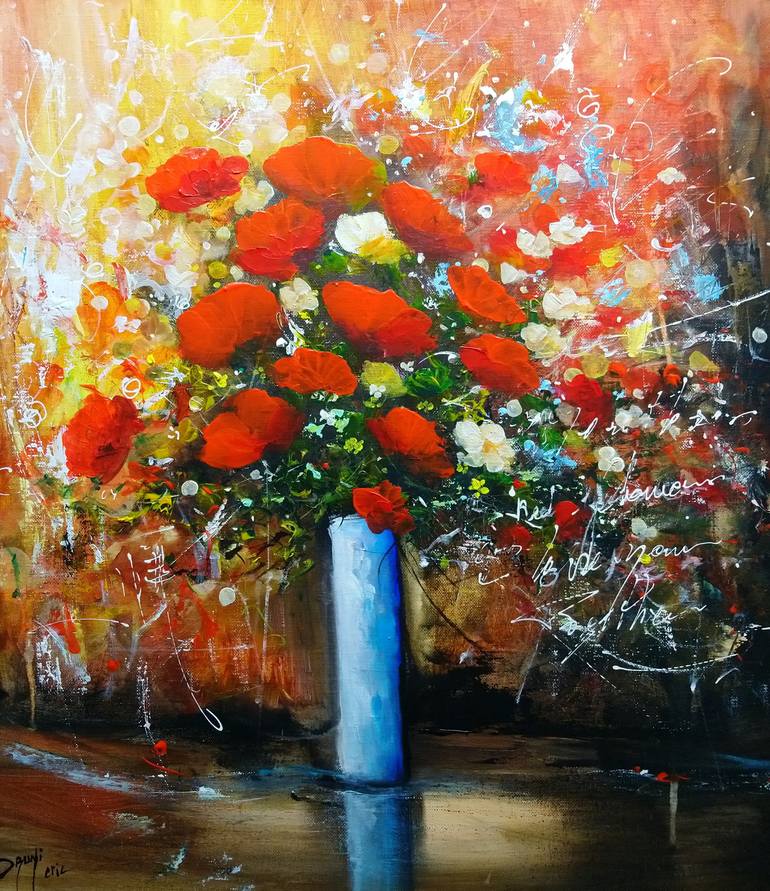 The artwork "Red flowers in blue vase" is an explosion of vibrant colors and matter. A bouquet of bright red poppies is highlighted by a background of warm, orange hues, creating a striking contrast. The petals of the flowers are rendered with broad strokes of paint, giving the impression of a luxur...