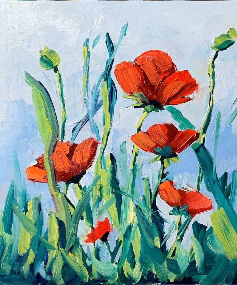Red poppies flowers. Botanical floral oil painting. This is one of a kind original oil painting. ►100% handmade oil painting on canvas board ►Dimensions: 30 x 24 x 0.3 cm (unframed) ►To see the details of the painting; please click "ZOOM" to enlarge the images. ►It is made in an impressionistic st...