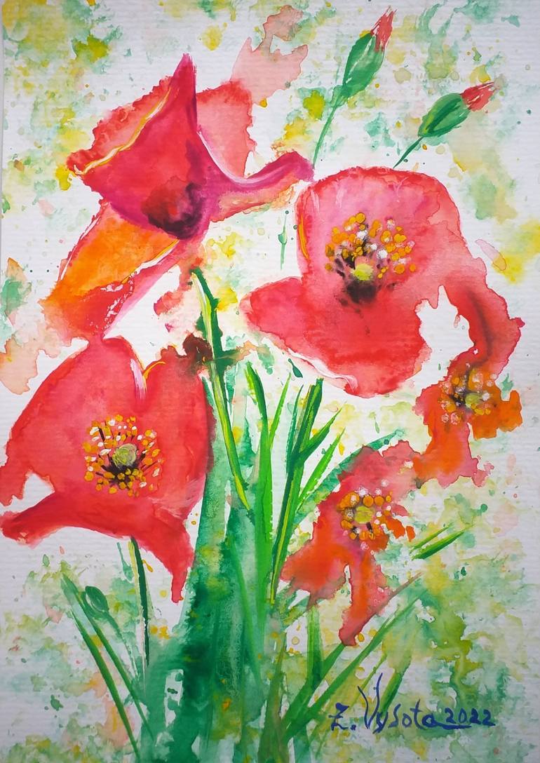 Red poppies bloomed in my garden. They wave their petals softly in the wind. The scarlet bush adorned my green garden. I will draw them to preserve this beauty and tenderness. Here the painting is ready, Ilook at them, poppies wave their petals to me, although not in the wind. --- This is an ...