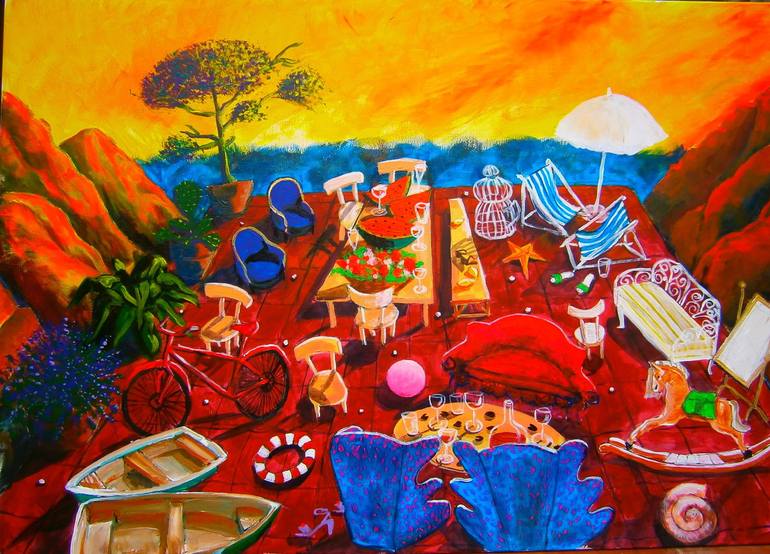 Sunset at a terrace above the sea. Siesta among the mountains, good life