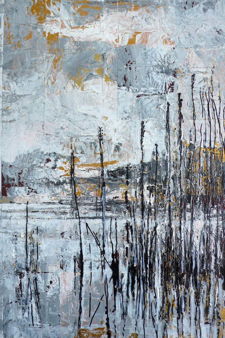 Acrylic and pen on gold and bronze coloured foil. The piece is positioned centrally on an A1 cartridge paper. The subject matter is a reed bed in winter.