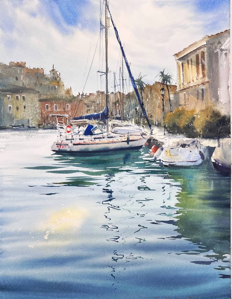 Immerse yourself in the tranquil elegance of Port Saplaya, a picturesque harbor near Valencia. This watercolor painting showcases the interplay of light and shadow, from the sun-kissed sailboats to the textured pier. The inviting blues of the water and the delicate reflections capture the spirit of ...