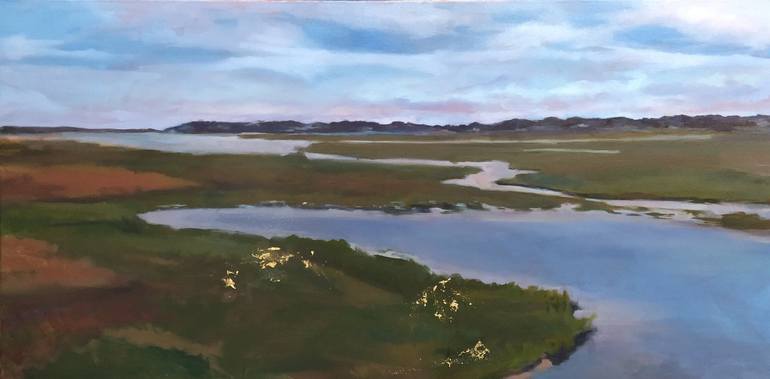 SCAPE Collection-special places on my journey of life Reflections 40x20 oil and gold leaf on canvas 2023 The inspiration for this piece was the marshlands of Cape Cod, MA. The gold leaf is a random representation of reflections from the sun hitting sections of dune grass.