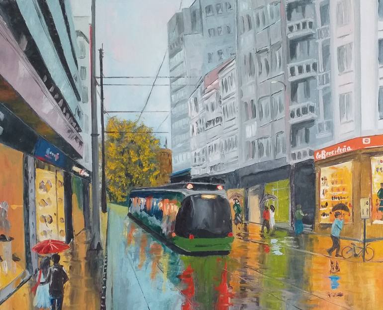 Ciudad lluviosa de otoño, lleno de coloridos y vibrantes reflejos. Por las carreteras mojados se reflejan las vitrinas coloreados de las tiendas.El tranvía se mueve por la ciudad como oruga verde con ojos brillantes.Las personas por sus preocupaciones no se dan cuenta de la belleza en la que viven. ...