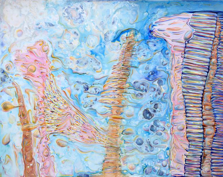Like with most of my work, this kind of abstract painting contains a prevalence of flow, movement and illuminating colours or light, from which we get all the different hues. So, it is a depiction of fluidity and light turning into rainbow patterns, derived from the experimenting and deliberate stro...