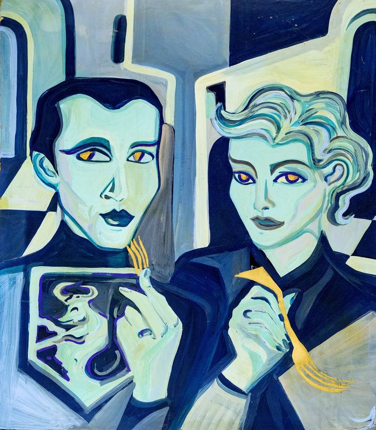 Portrait of regine Thorre and eduardo Rebelloda silva, friends of the artist. The forks by hand in an offbeat decor in the style of Gorgio de Chirico give the canvas its surreal side, its magic ... to discover: polaroid portrait of the models for the creation of this canvas It's up to the spectator ...