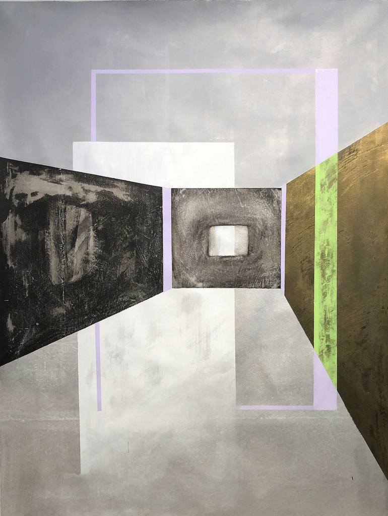 Abstract painting 130x100cm It seems to be a kind of recollection of the past, with the fine lines appearing on the surface due to the use of frottage technic and with other elements disappearing behind it. The use of silver, steel and pearl black acrylic paints gives the painting shinning surface, ...