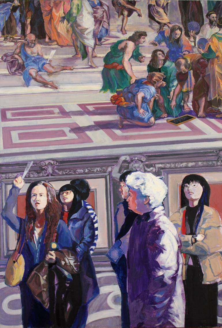 The image displays a contrast between contemporaty cultures, and history. The artist was attracted to the second paintings at the Vatican Museum that shows an increased dynamism of the figures in the School of Athens. I always enjoy rendering the figure. This section of the painting focuses on Eucli...