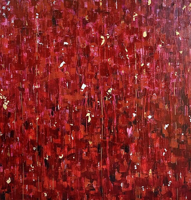Red abstract painting. Reds, Crimson, blood red, ruby red, vermilion red, pink, black, gold leaf, Silverleaf, glitter