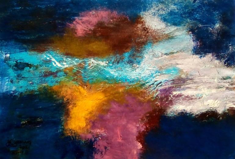 This work titled 'renewal' was inspired by my thoughts of gratitude towards the universe for the abundance available on earth .It was painted on paper with printing inks and oil pastel. Having painted with water colour earlier in my career, I was eager to experiment with these inks usually used for ...