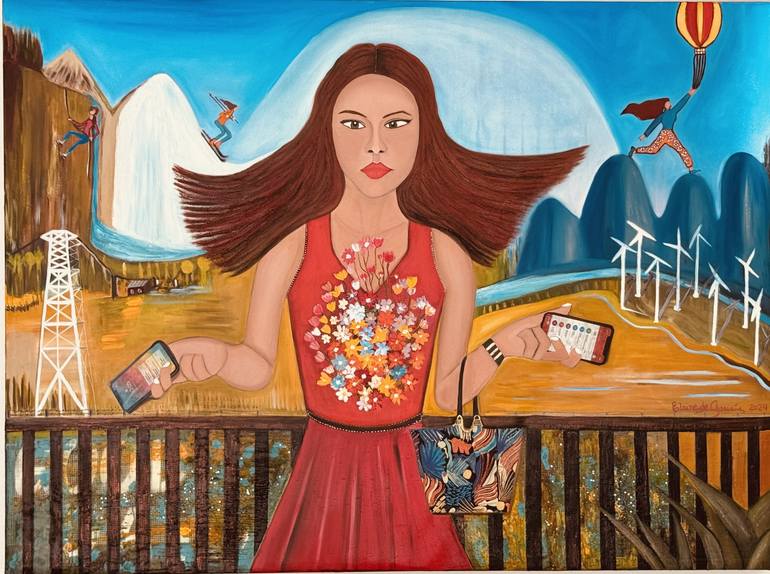 This painting reflects the challenges and hustle of modern life, illustrating our constant pursuit of brighter days. Hope drives us forward. The artist portrays a woman embodying a hopeful mindset, using creative visualization to shape her future. Her prominent figure in the painting symbolizes her ...
